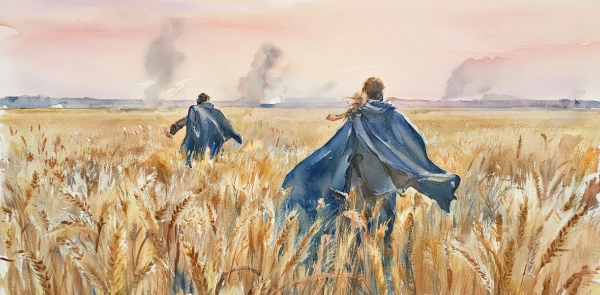 After running past countless brick buildings, all that lay ahead of them was the high wall and the stone gate leading out to the large fields. The paved path ended abruptly. Beyond it lay the country road—hard-packed earth, marked by the deep ruts of countless horse-drawn carts. Beyond the gate, a vast expanse lay before them: scorched earth, covered in ash, crisscrossed with black scars where the fire had engulfed entire fields. Eva and Lennar rushed out without hesitation and let themselves be swallowed up by the golden sea of wheat.