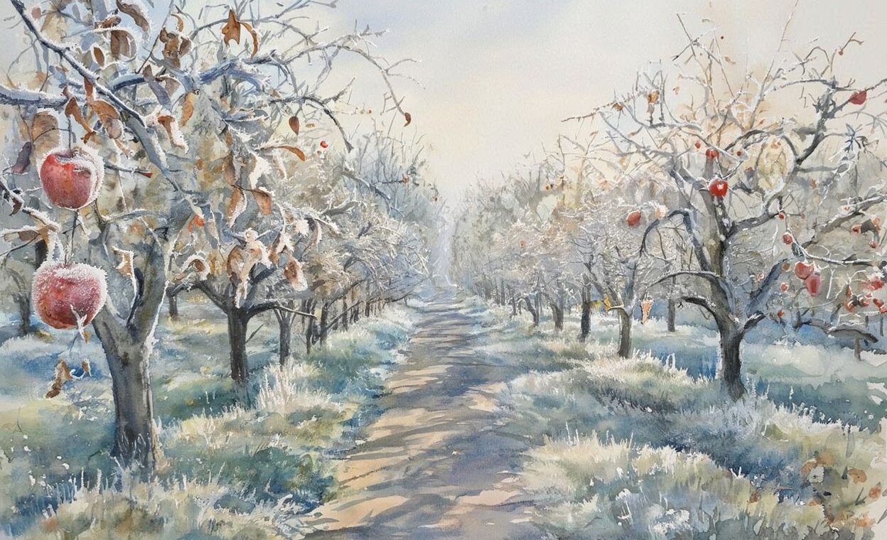 Die eisige Atmosphäre des frühen Morgens war mittlerweile einer klaren Winterluft gewichen, über ihnen spannte sich ein makellos azurblauer Himmel und doch schimmerte überall der Frost als feine, weiße Handschrift des Winters. Die westlichen Ausläufer von Dreybergen empfingen sie mit langen Reihen alter Obstbäume, deren pralle Früchte mit einer dünnen Eisschicht überzogen waren. Zwischen den Stämmen glitzerte Reif, der sich wie stiller Schnee auf Äste, Mauern und die letzten herbstgelben Blätter gelegt hatte. Als sie weiter ritten, öffneten sich die Hänge zu breiten, terrassenartigen Weinbergen. Die Reben standen in voller Pracht, doch die knorrigen Ranken und Blätter waren steif gefroren. Von den Höhen dahinter pfiff eine scharfe Brise herab.