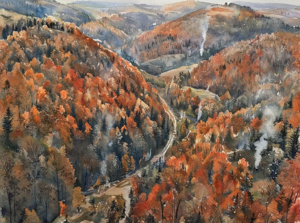 Drei dicht bewaldete Hügel tauchten nun aus den Wolkenbänken auf, spitz wie alte Wachtposten. Über ihren Gipfeln hing Dunst und der Wind trug den Geruch von Erde, Rauch und nassem Holz herauf. Dreybergen lag am Rand der weitläufigen Kornfelder von Hochsaat, dort, wo das Gold der Felder allmählich in grüne Schatten überging. Zwischen knorrigen Eichen, Hainbuchen und uralten Kastanien zogen Wildpfade dahin, auf denen Rehe, Schweine und sogar die scheuen Nebelhirsche zu finden waren. Für die Bewohner von Hochsaat war die Gegend schlicht der „Alte Wald“. Hier fand man kleine Köhlereien, deren Rauch dünn zwischen den Baumwipfeln aufstieg, und verstreut lagen winzige Dörfer, Einsiedeleien und Tavernen in der Tiefe der Wälder.