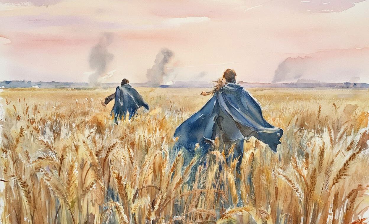 Vor ihnen teilten sich die Pflanzen wie ein goldenes Tor. Dahinter: eine verbrannte Fläche, schwarz, still, mit kniehohen Stoppeln. „Wir müssen darüber“, flüsterte Eva, „und zwar möglichst schnell.“ Lennar nickte, setzte zum Lauf an – doch plötzlich schossen zwei Gestalten aus dem Schutz des Korns hervor. Einer war der Glatzköpfige mit dem pelzbesetzten Mantel. Fiebrige Röte lag auf seinen Wangen, der Schweiß glänzte auf der Stirn. Seine Brust hob und senkte sich heftig, doch die grauen Augen blitzten wie die eines Bussards, der einen Feldhamster fixiert hat. Er war bei Lennar, bevor Eva reagieren konnte.