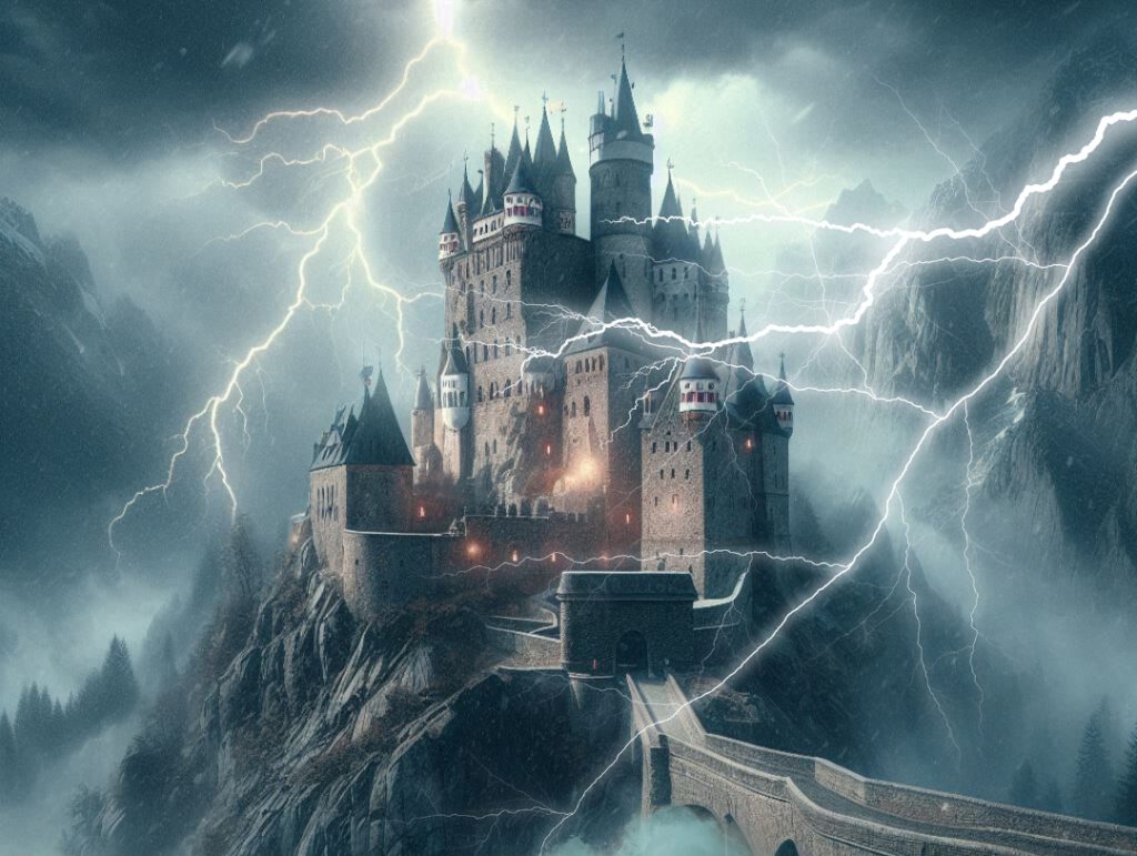 Zuerst sah man nur die oberen Spitzen der Türme, doch je näher sie kamen, umso deutlicher trat die Burg aus dem Nebel hervor.