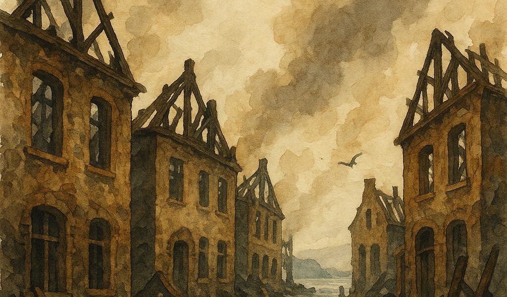 After parking their flying machines in the shadow of the building, they took stock of the situation. The port of Hochsaat lay like a wound in the land. Where once neat warehouses had stood side by side, charred ruins now gaped like screaming mouths at the sky. Entire roofs had been torn off by the pressure of the flour dust explosions, the roof trusses protruding like bony ribs into the sky. Shattered window glass crunched under their boots, the acrid smell of burnt grain hung in the air. Crows and ether gulls circled above the buildings. Some fluttered down among the rubble, pecking at the remains of grain sacks or something the two preferred not to look at too closely. Burned-out warehouses, collapsed cranes, charred carts. Behind them, where the quay wall ended, the ground sloped down, not into the sea, but into the white of the clouds. Below, ether currents flowed like sluggish rivers. In the distance, the neighbouring islands of Goldendale floated silently – unsuspecting, unscathed. A bitter sight.